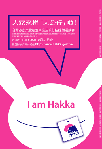 公開徵選能代表台灣客家文化精神,獨具創意具有商品化之品牌象徵造形─公仔娃娃,以作為未來行銷台灣客家文化創意精品店的代言人。歡迎各界設計高手,共襄盛舉參與公仔設計競賽。